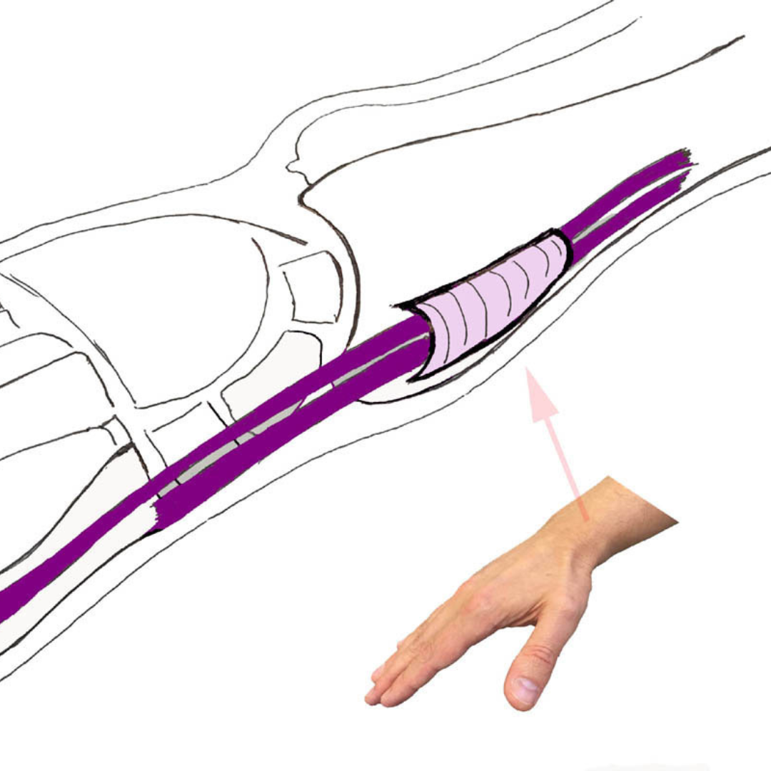 Compression du nerf médian au poignet, causant douleur et engourdissement dans la main.
