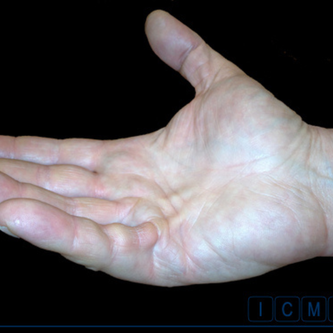 Épaississement de la peau de la paume entraînant une flexion progressive des doigts.